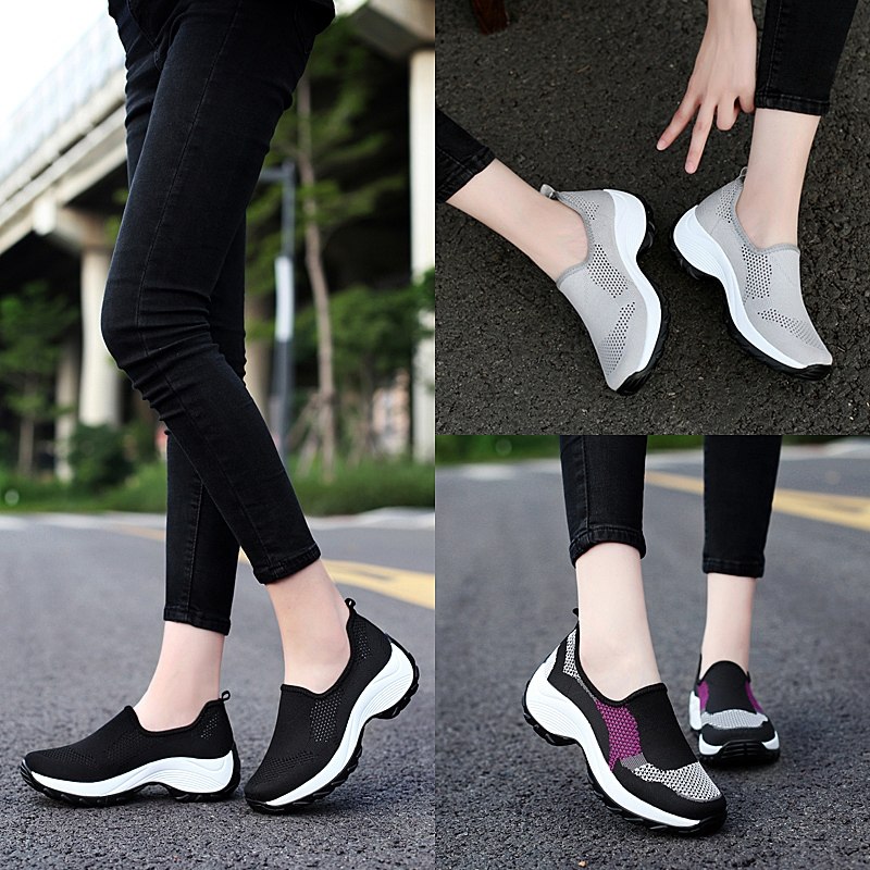 夏季新款一脚蹬飞织厚底轻便百搭健步鞋休闲鞋女鞋大码妈妈鞋网鞋