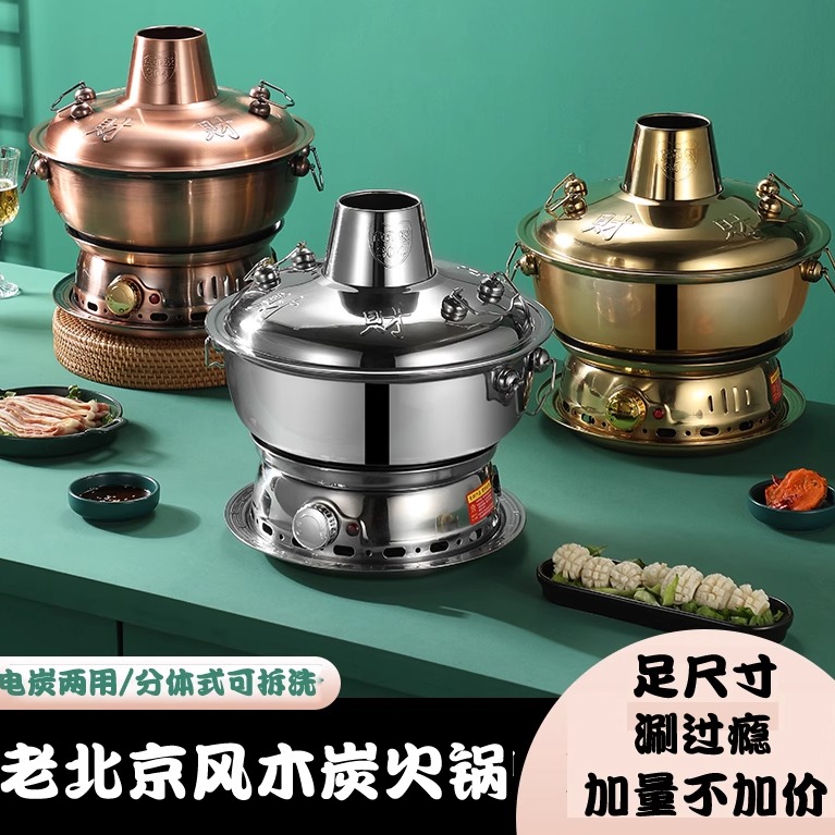 老北京木炭火锅炉不锈钢仿铜鸳鸯锅家用炭电两用老式火锅网红火锅