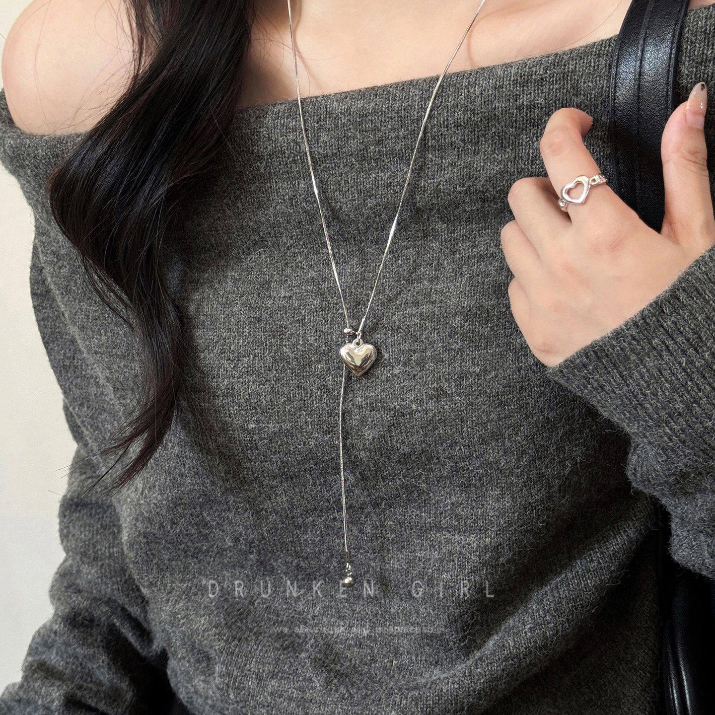 极简银色爱心吊坠项链女款秋冬韩系小众设计配饰长款抽拉式毛衣链