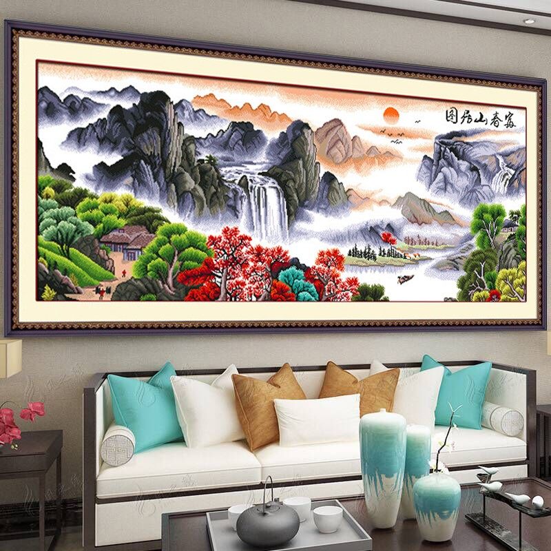 富春山居图风景流水生财机绣十字绣成品绣好客厅大画聚宝盆装饰画