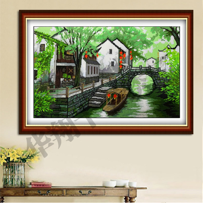 电脑机绣十字绣成品江南水乡梦幻家园绣好的小桥流水风景装饰挂画