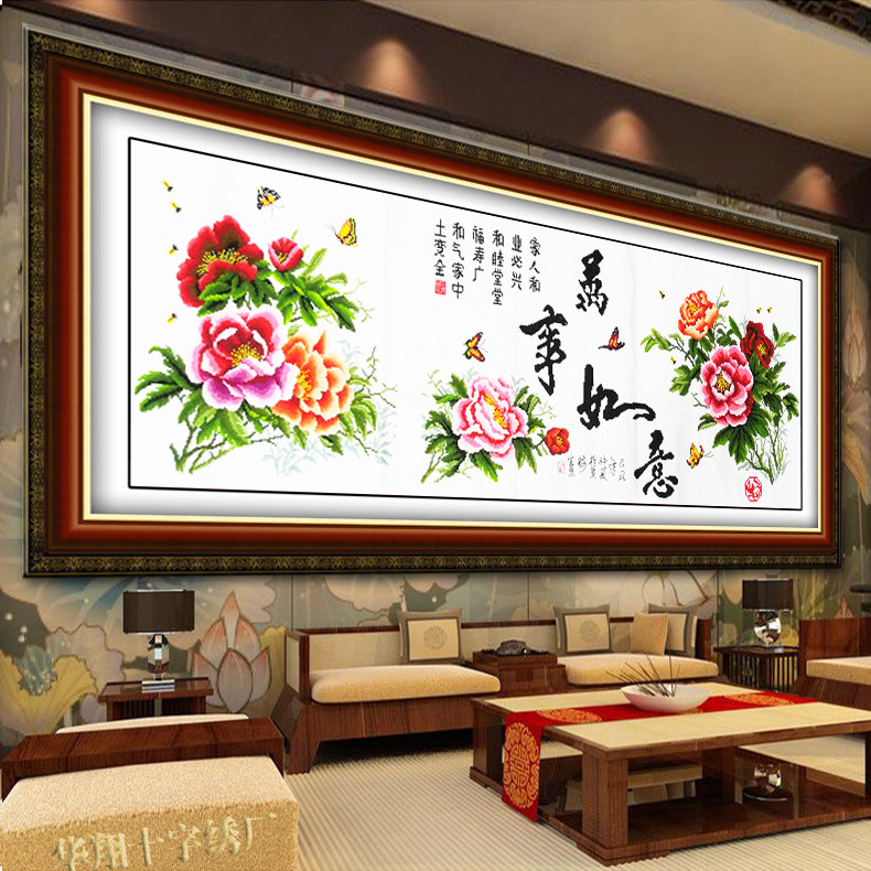 电脑机绣十字绣成品字画万事如意牡丹版绣好的客厅简约装饰画出售