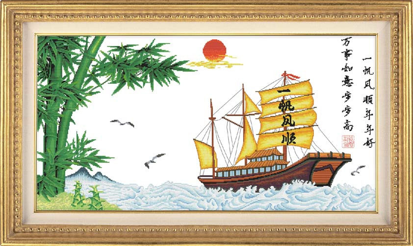 机绣十字绣成品一帆风顺祝福版风景竹子船旭日十字绣电脑绣机器绣