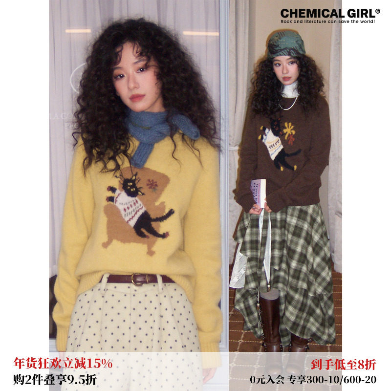 森女部落甜美风可爱小猫设计感套头针织衫女秋季新款长袖宽松毛衣