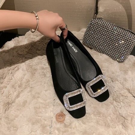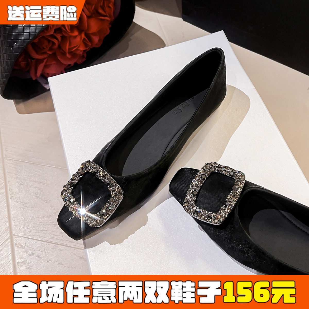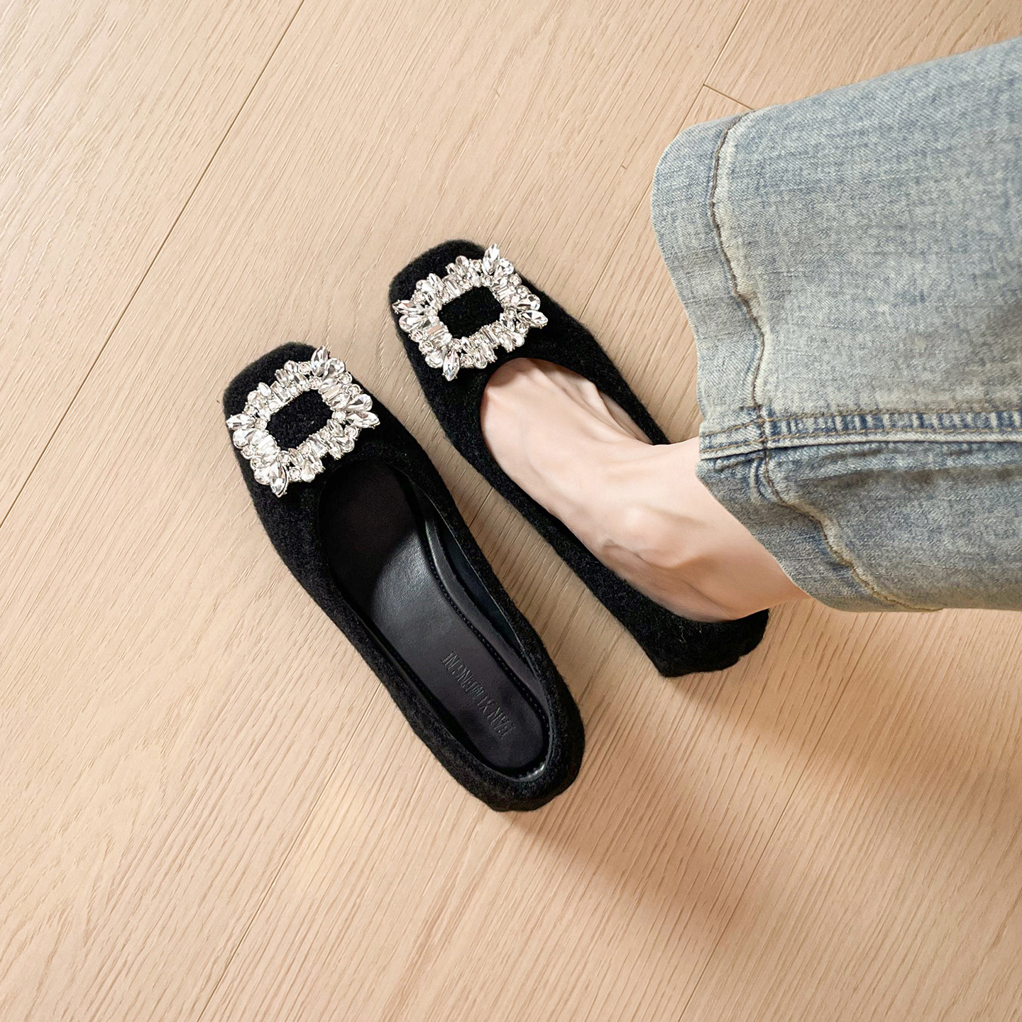 米霏~方头浅口单鞋女冬平底2025新款方扣水钻配裙子瓢鞋大码女鞋