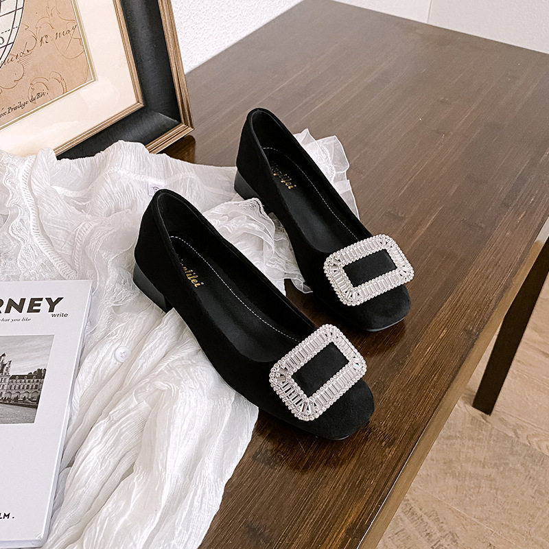 2025春款新款软羊皮女鞋方扣水钻单鞋女中跟粗跟妈妈鞋绒面乐福鞋