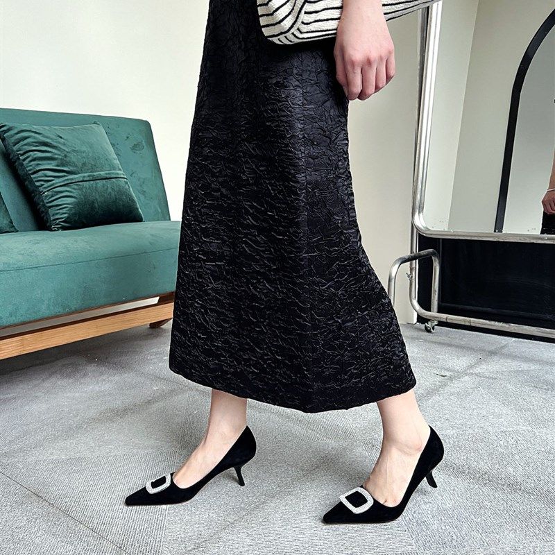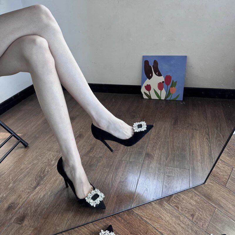 2025春夏新款黑色绒面尖头浅口细跟高跟鞋绝美方扣水钻单鞋9cm