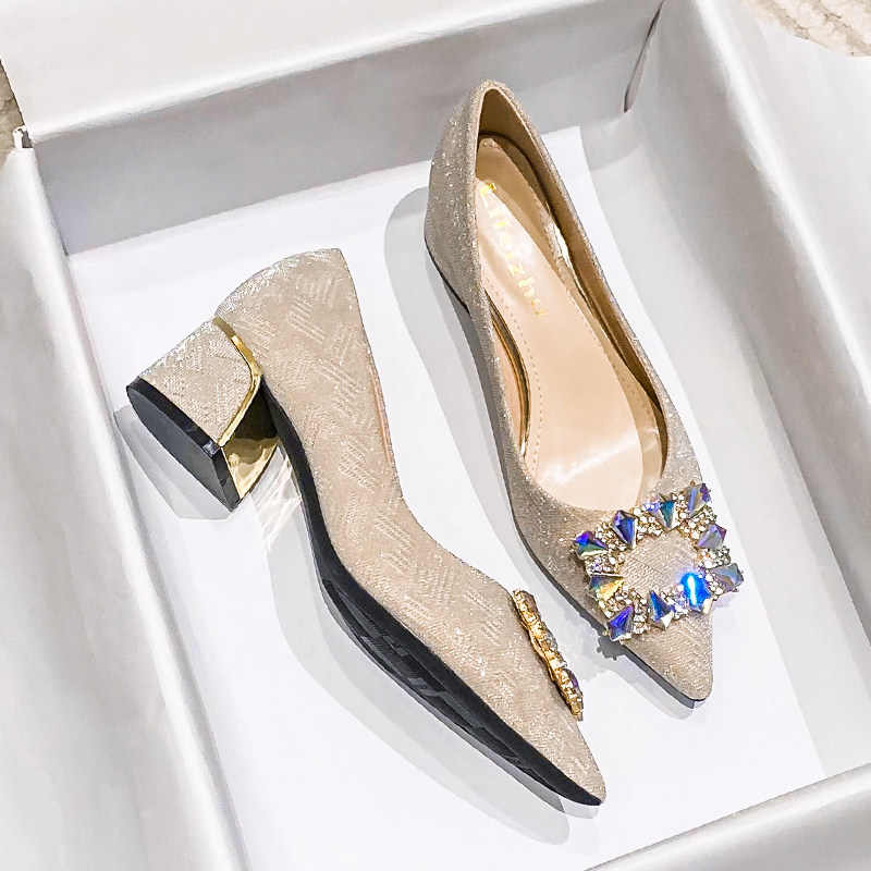 法式方扣水钻单鞋女2025新款秋季浅口气质瓢鞋粗跟晚晚鞋大码女鞋