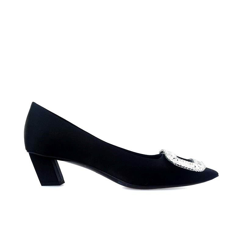 新款欧洲站绸缎低跟女鞋RV方头方扣水钻单鞋银扣浅口气质金属百搭