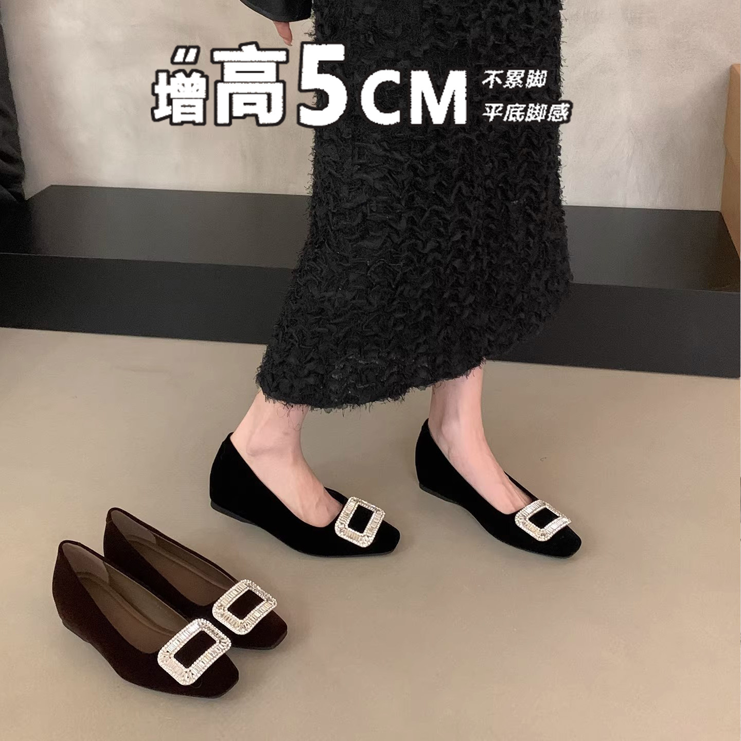 【TFM】内增高4CM~玛丽珍鞋女新款方头平底水钻方扣浅口加绒单鞋