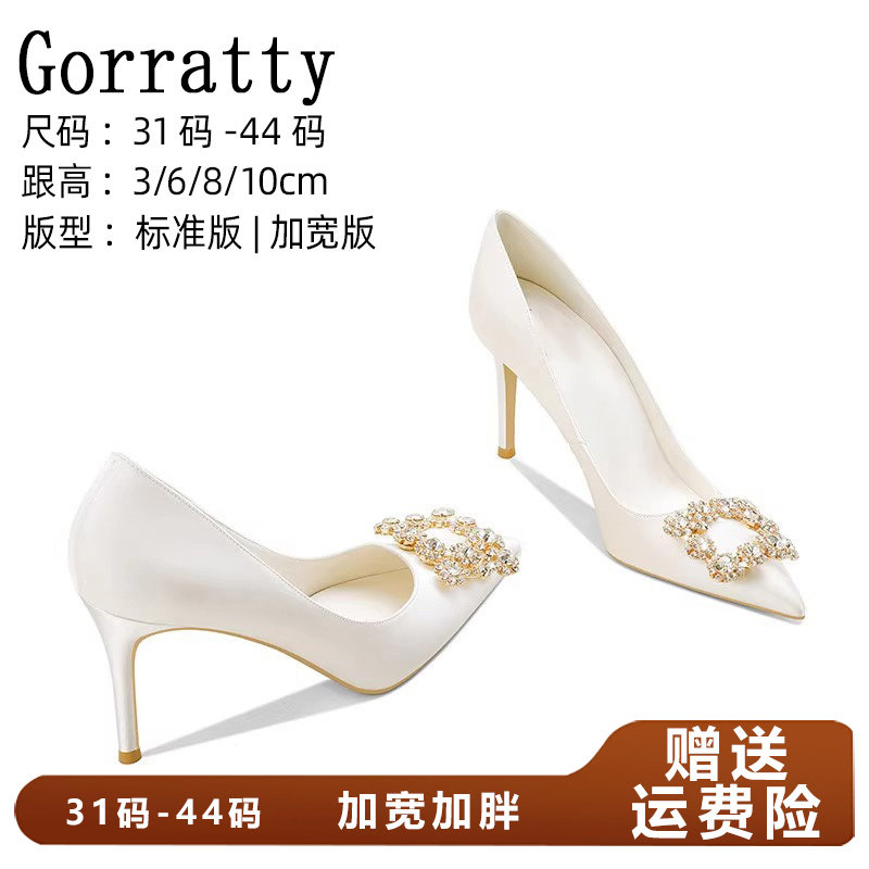 绝美婚鞋秀禾婚纱两穿高跟鞋女胖脚宽白色方扣水钻单鞋大码女鞋43