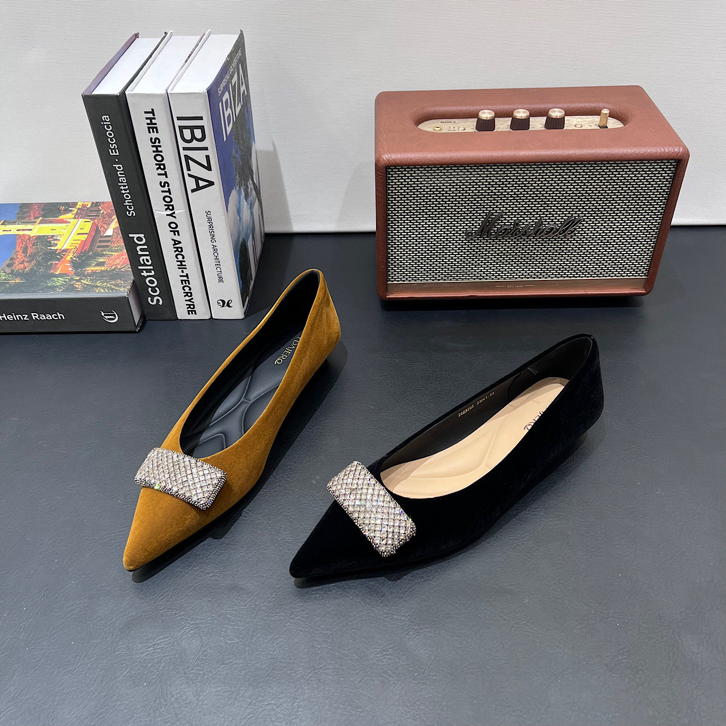 单鞋女2024秋冬新款韩版尖头水钻方扣加绒平底鞋浅口百搭黑色瓢鞋