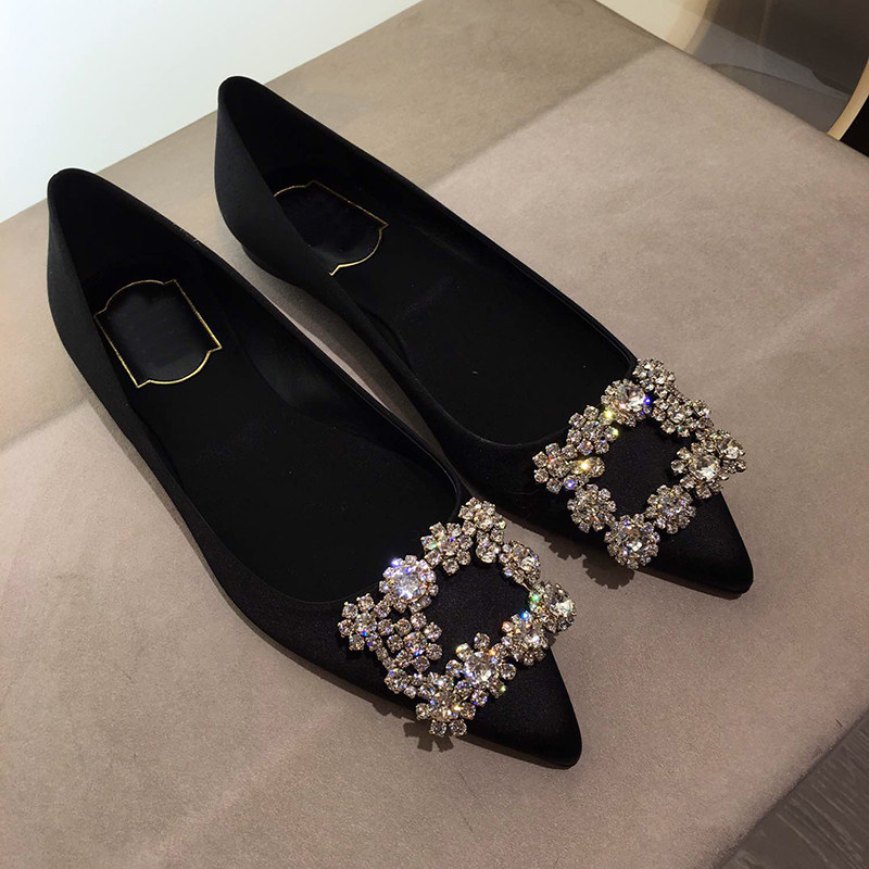 欧美方扣水钻单鞋雪花扣绸缎浅口女鞋伴娘婚鞋黑色船鞋尖头平底鞋