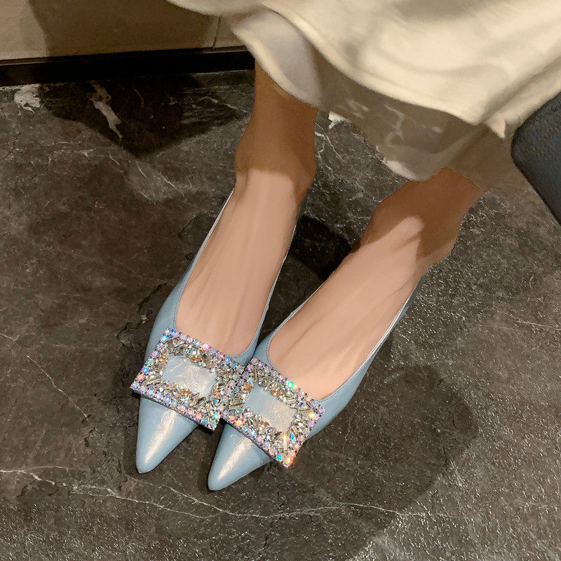 25春夏新款真皮低跟尖头蓝色浅口懒人鞋女内增高平底方扣水钻单鞋