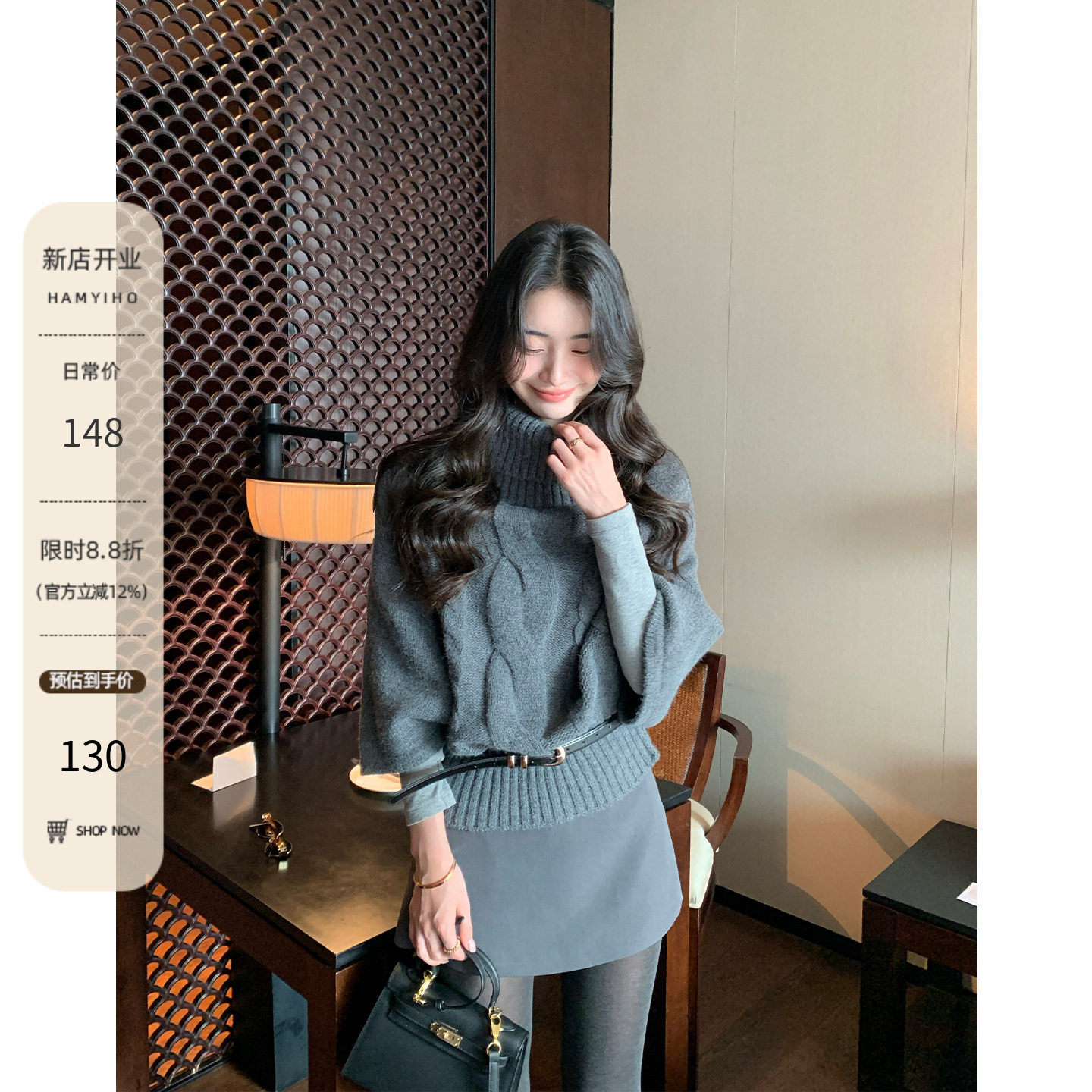 Asobio牦牛绒气质烟囱领蝙蝠袖通勤保暖百搭显瘦静奢风针织衫318