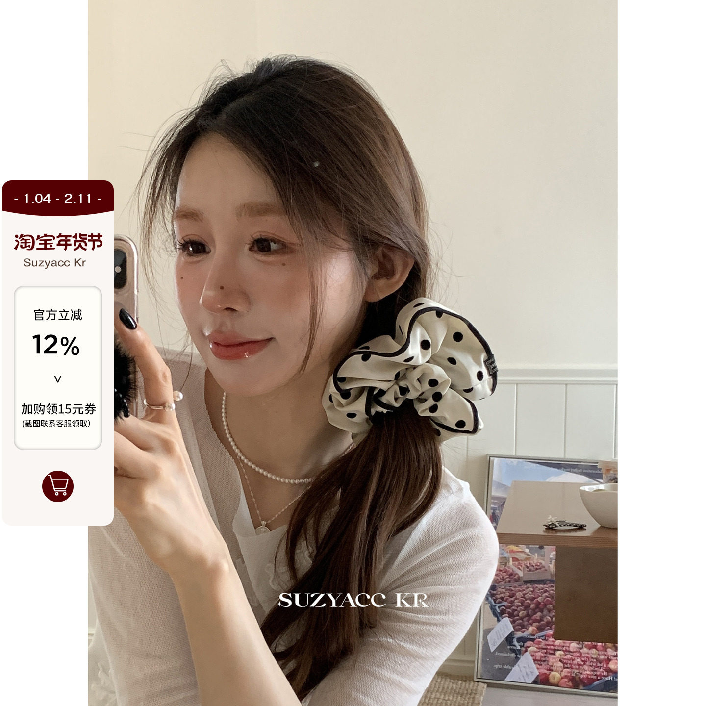 suzyacc kr黑白波点布艺发圈大肠圈法式复古低马尾绑头发皮筋头绳