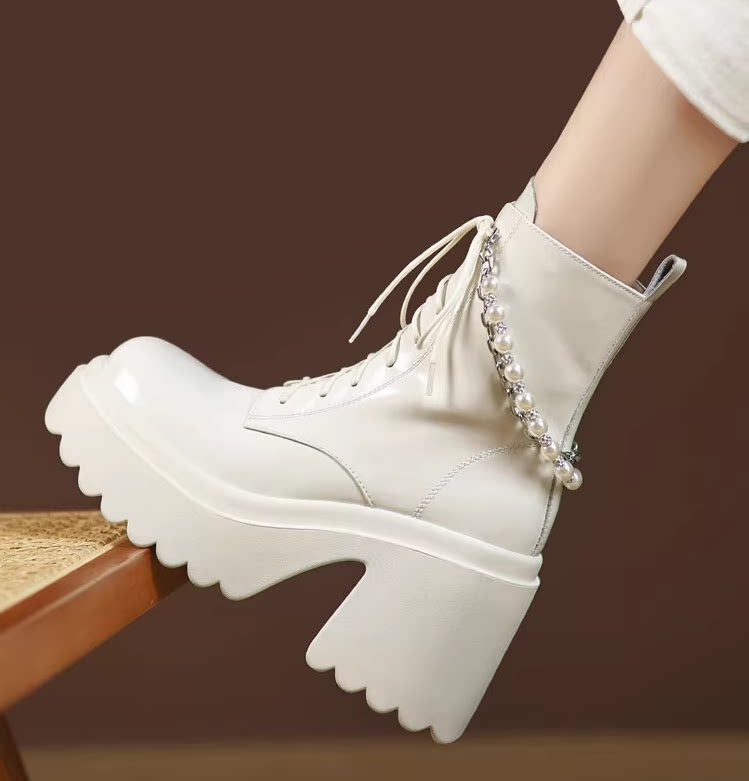 13CM珍珠链粗高跟厚底圆头系带马丁短靴隐形内增高真皮骑士单女靴