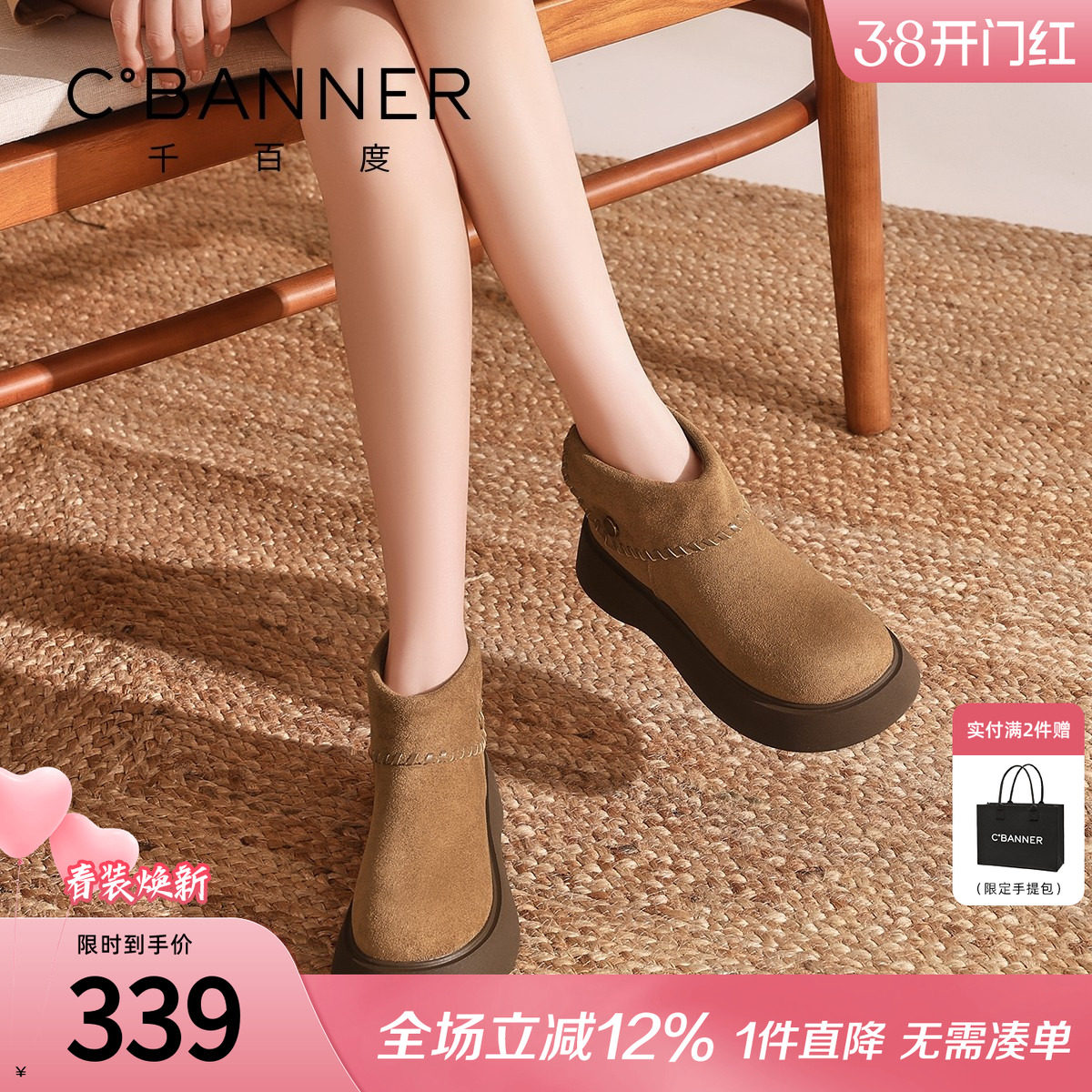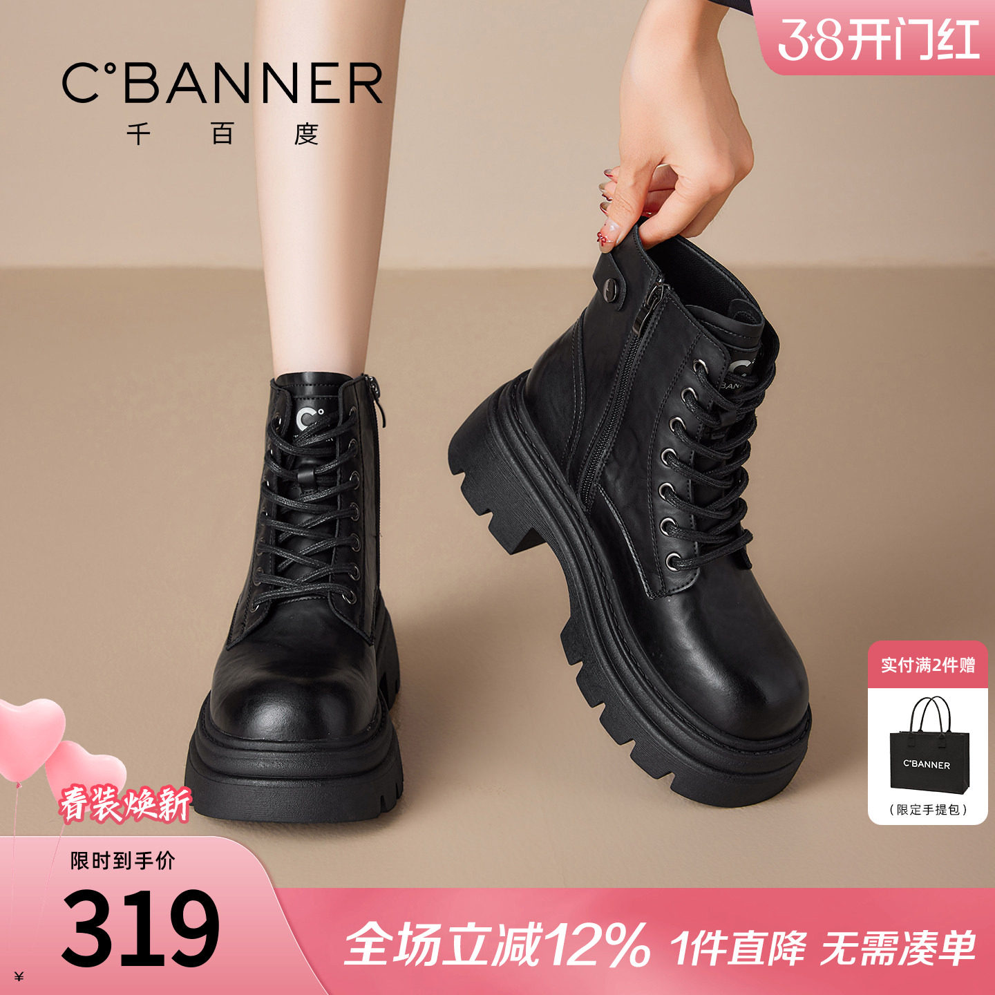 千百度厚底短靴女系带松糕新款复古单靴百搭短筒英伦风马丁靴女款