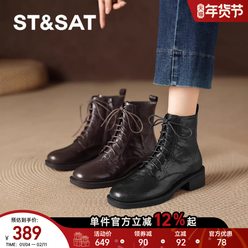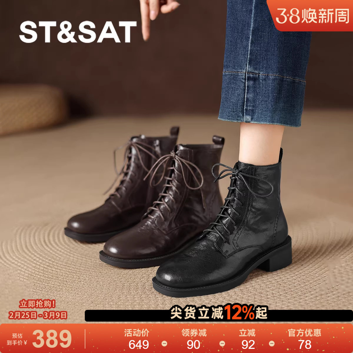 星期六2025新款英伦风系带马丁靴女粗跟短靴圆头机车靴黑色时装靴