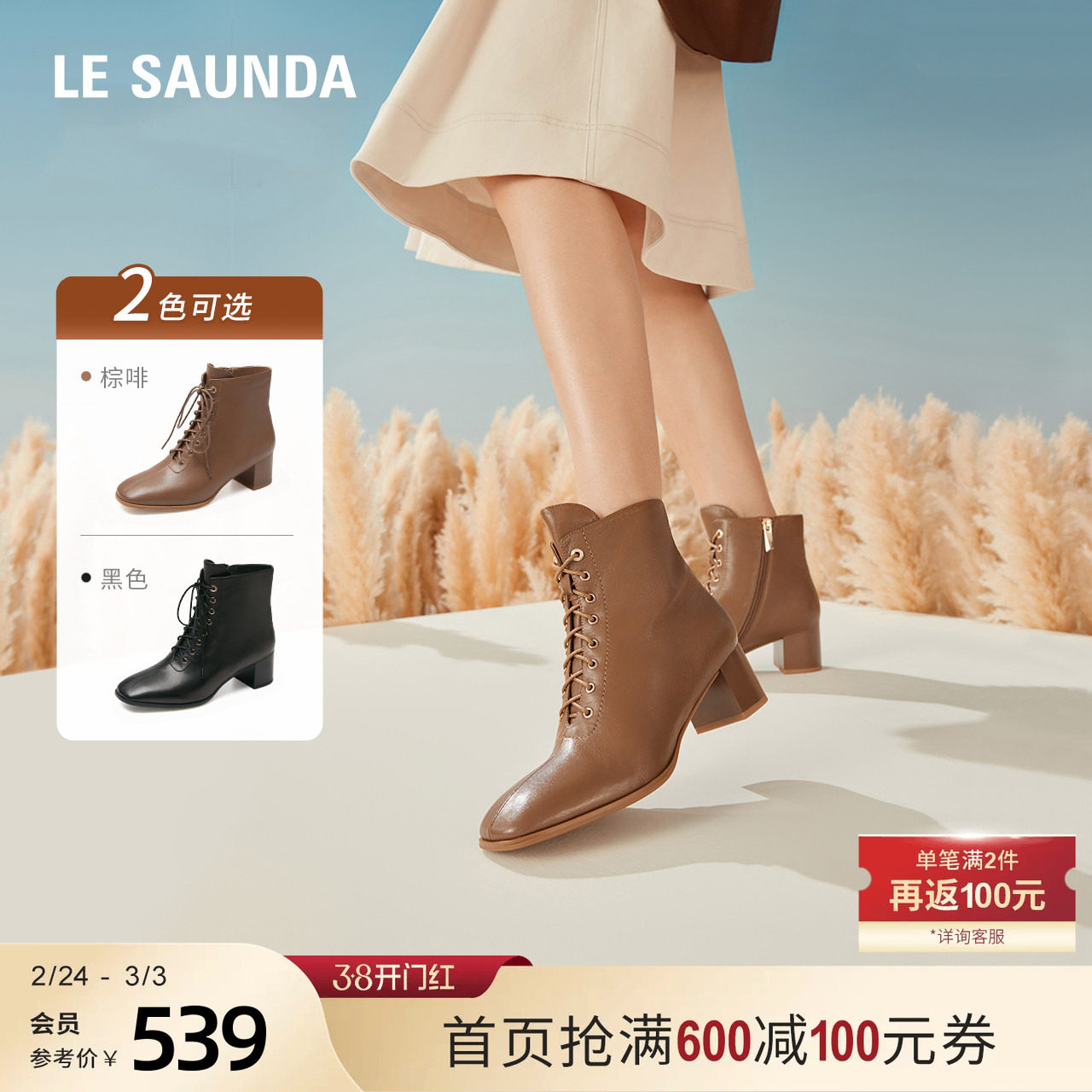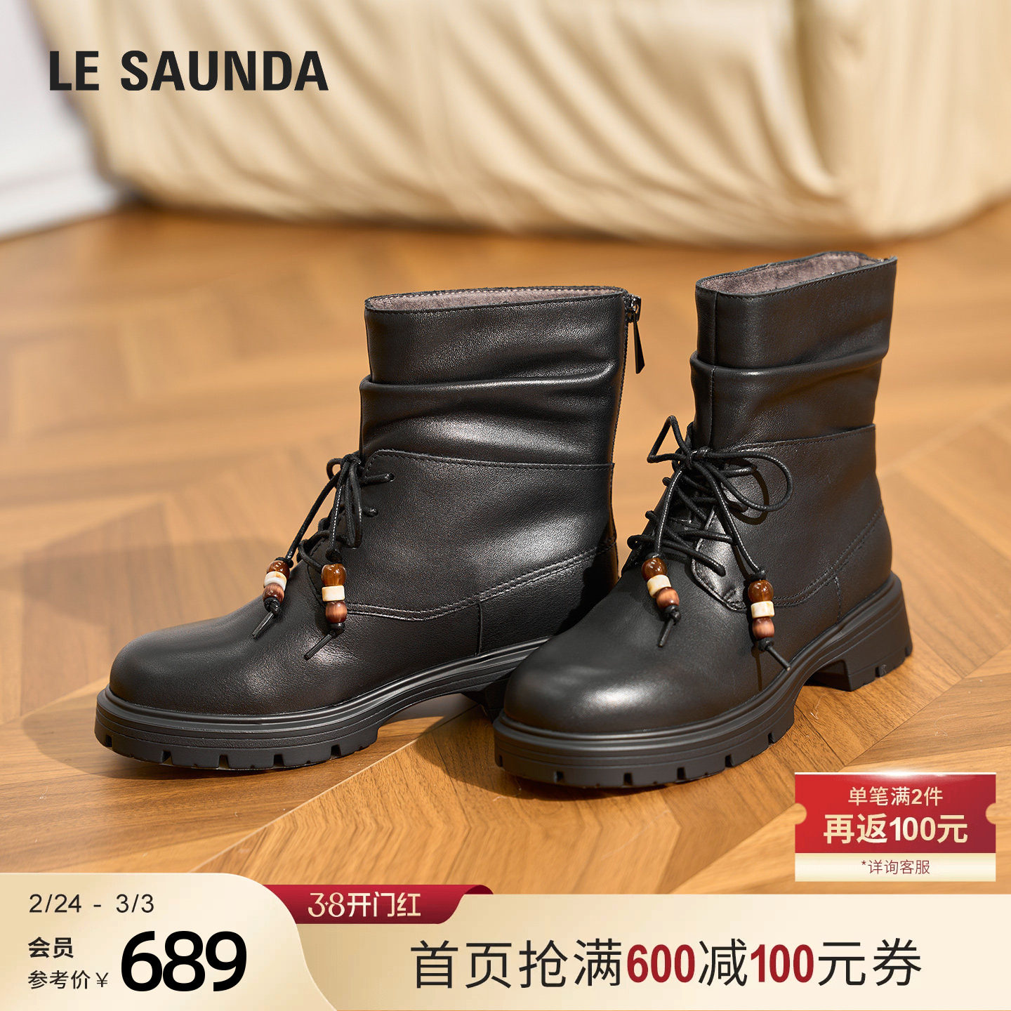 莱尔斯丹冬新款洋气真皮黑色粗跟系带马丁短靴子女6T42603
