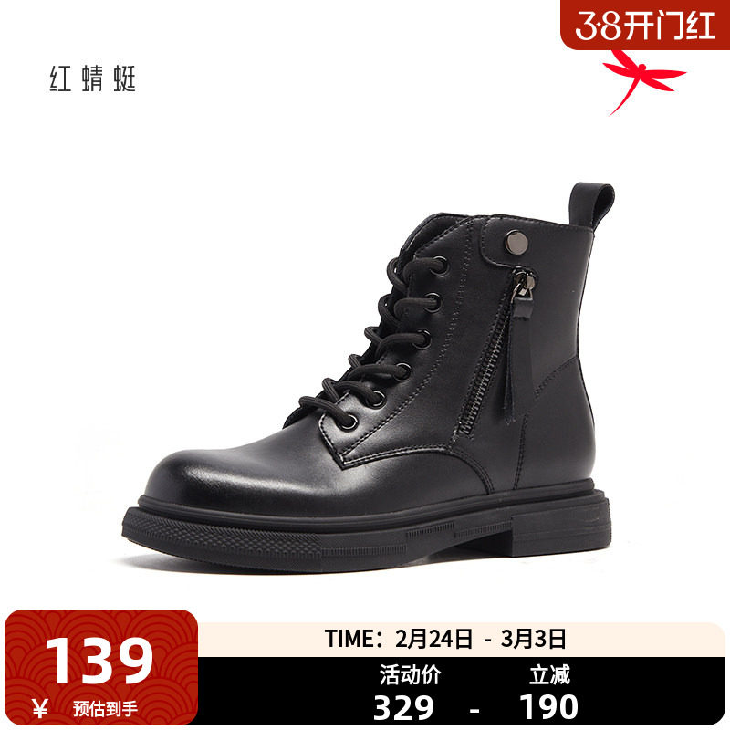 红蜻蜓马丁靴女2025秋季女鞋厚底短靴女英伦系带增高百搭皮靴女