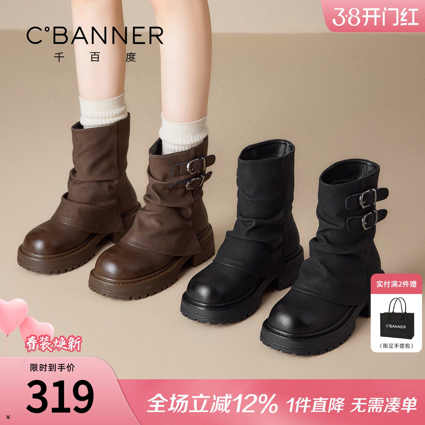 千百度手抓皮马丁靴女2025冬季新款美拉德中跟系带时尚厚底短靴子