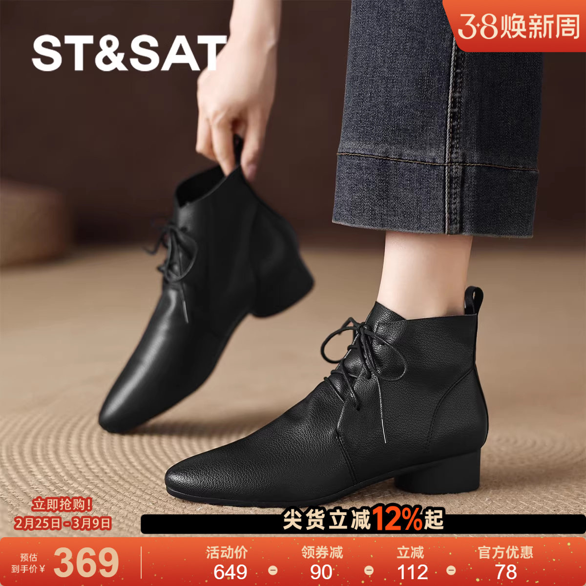 星期六粗跟短靴女款2025新款秋季瘦瘦靴系带短筒靴西部牛仔马丁靴