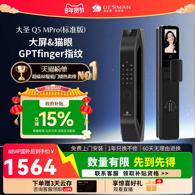 德施曼智能门锁猫眼大屏指纹锁密码锁家用大圣Q5MPro(标准版)