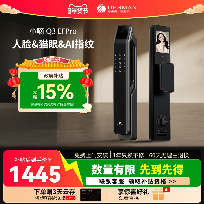 【新升级】德施曼智能门锁人脸猫眼大屏指纹锁密码锁小嘀Q3EFPro