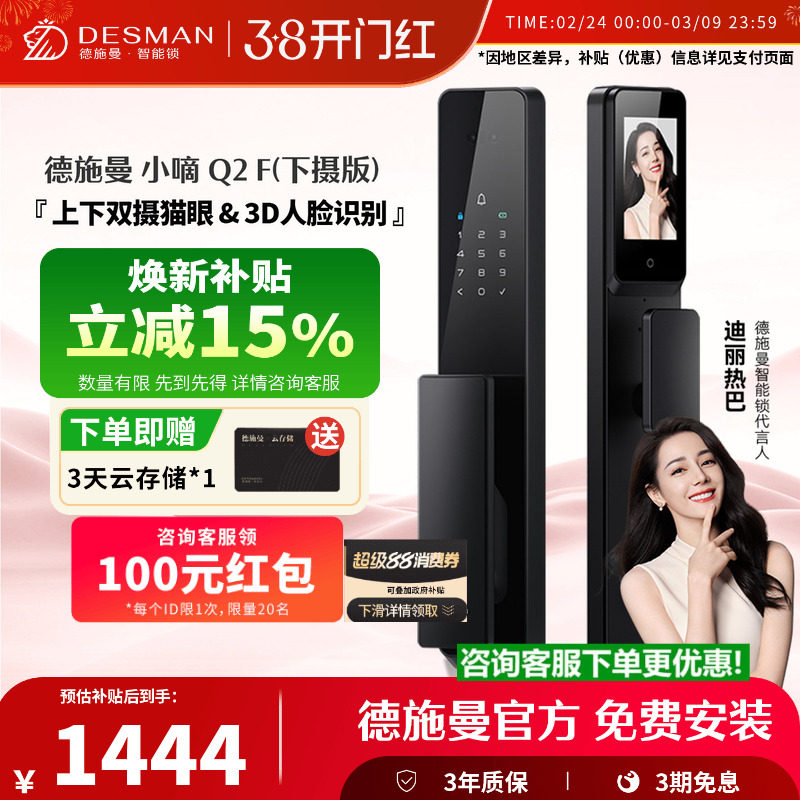 德施曼智能锁可视猫眼大屏指纹锁密码锁家用防盗门智能锁小嘀Q2M