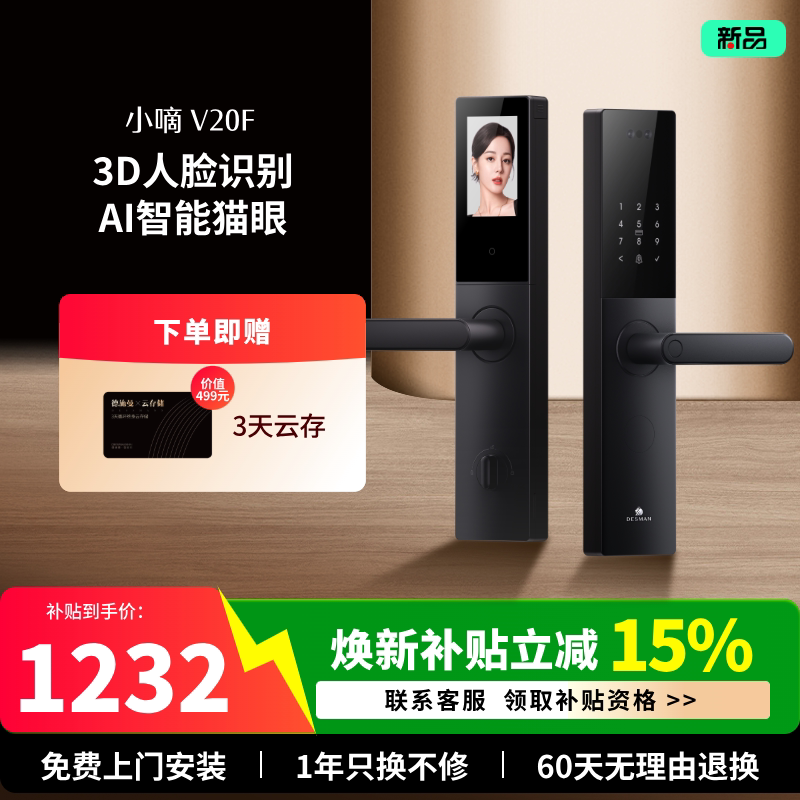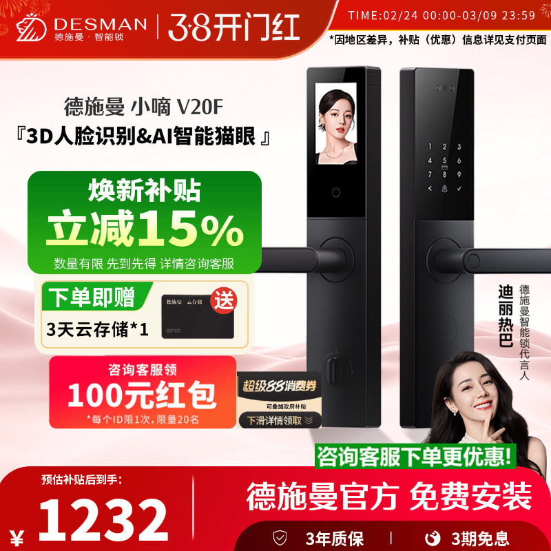 德施曼智能门锁3D人脸大屏猫眼指纹锁密码锁家用防盗门锁小嘀V20F