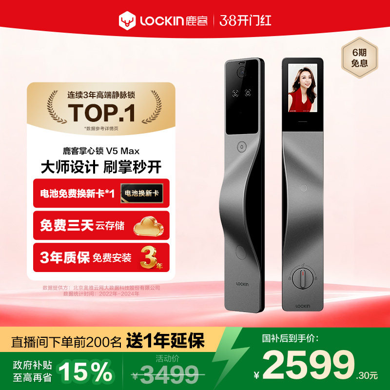 鹿客掌心锁V5Max掌静脉3D人脸智能门锁指纹锁密码锁家用门锁