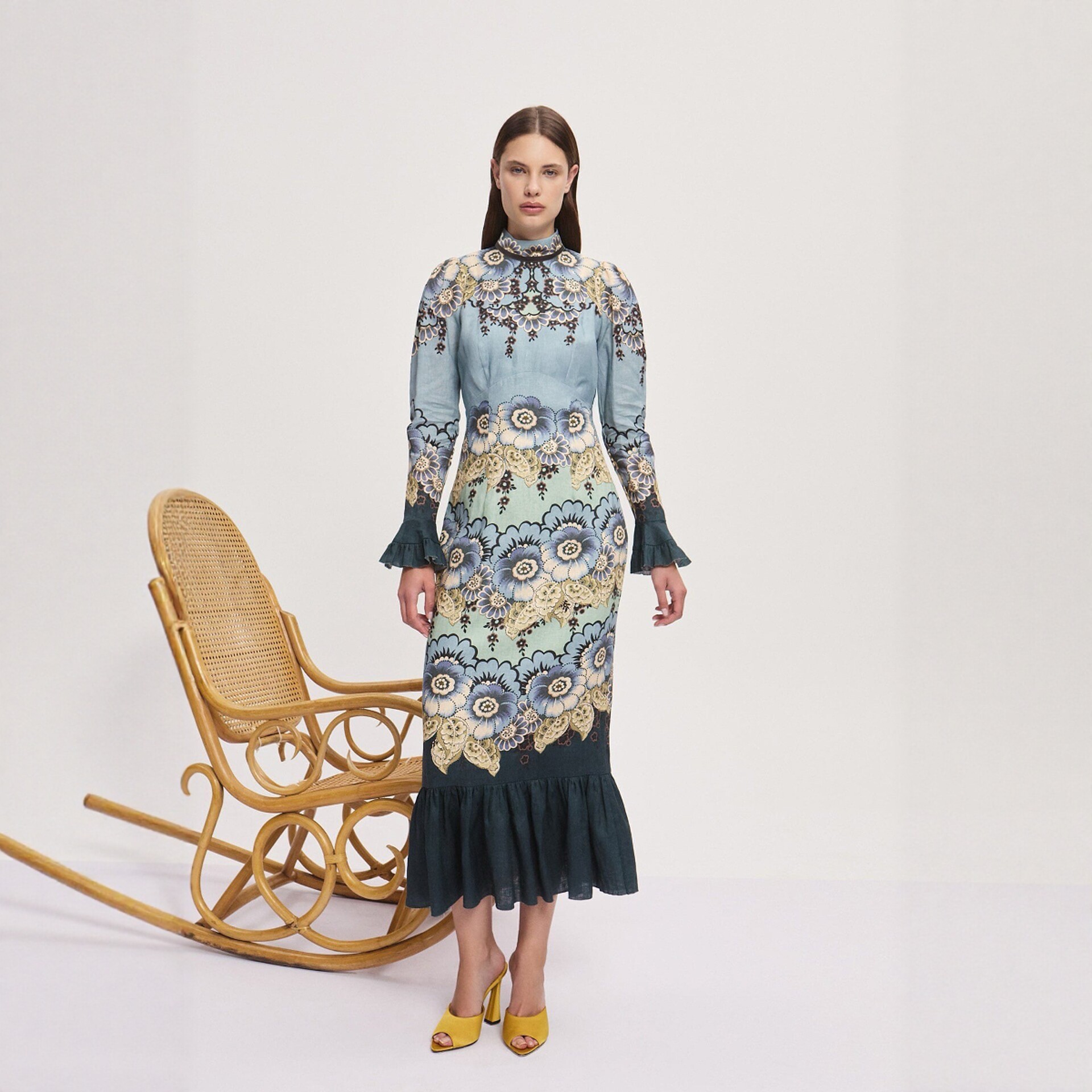 欧洲站印花立领长袖鱼尾连衣裙2025新款度假风沙滩拍照度假长裙女