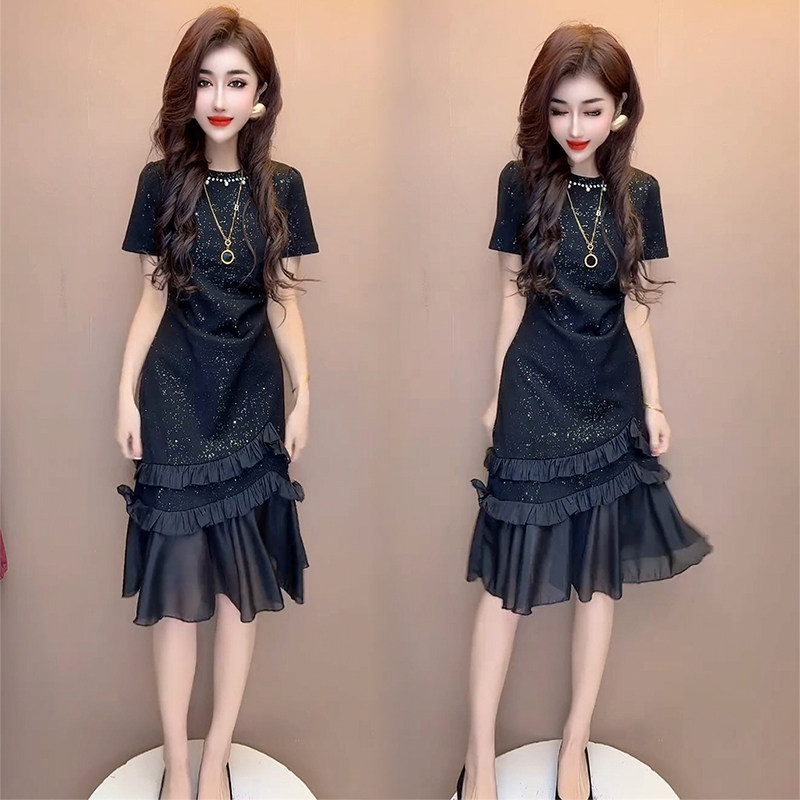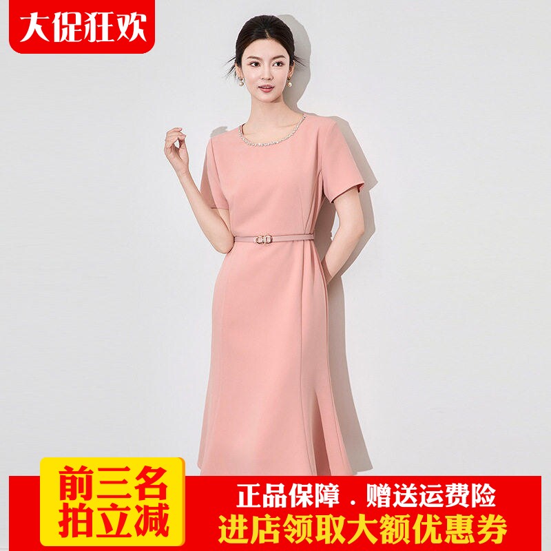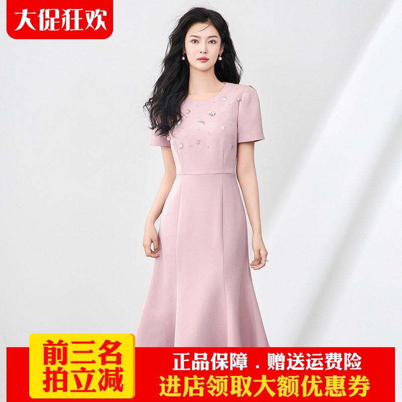 欧洲站2025夏季新款高级感通勤显瘦气质镶钻圆领短袖鱼尾连衣裙女