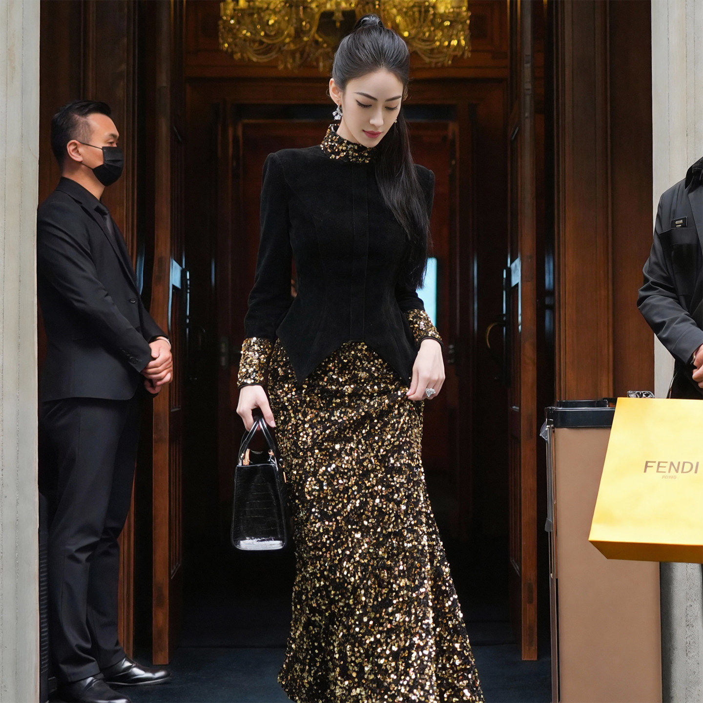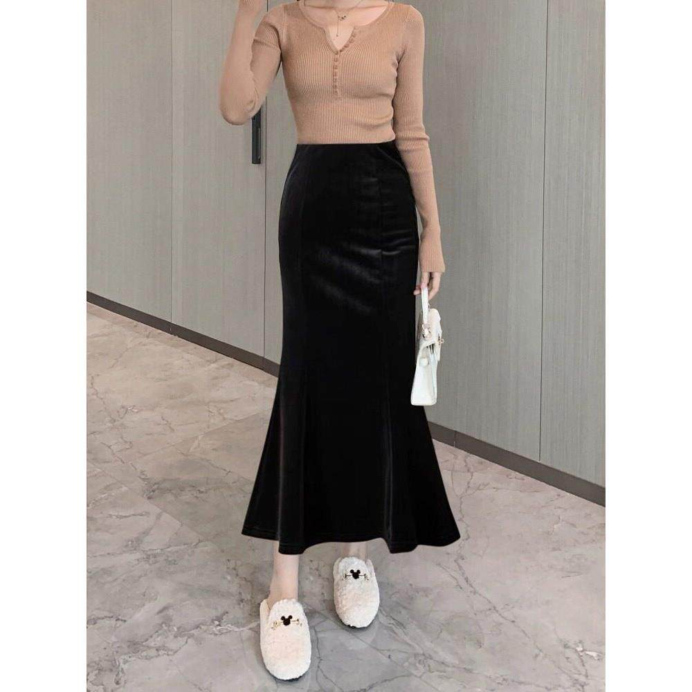 欧洲站2025年秋冬新款金丝绒鱼尾裙半身裙女黑色连衣裙高腰包臀裙