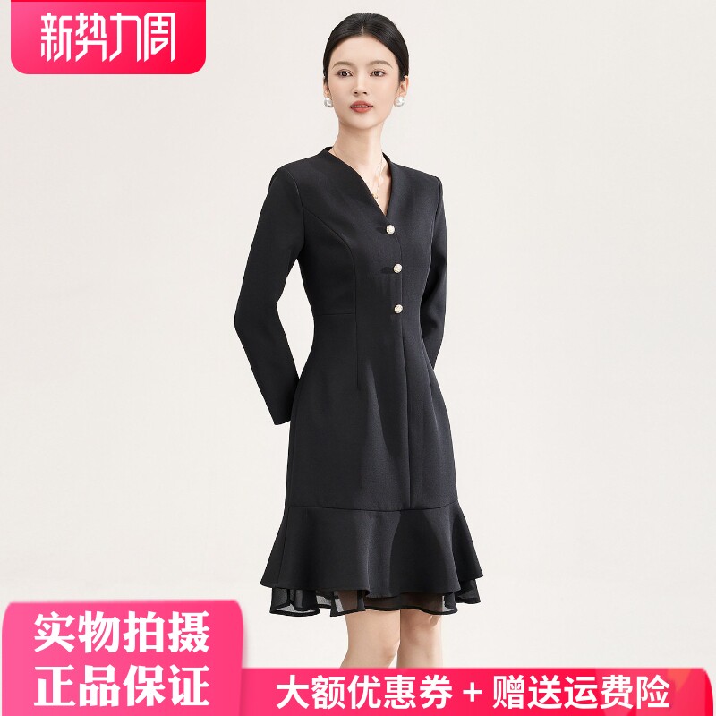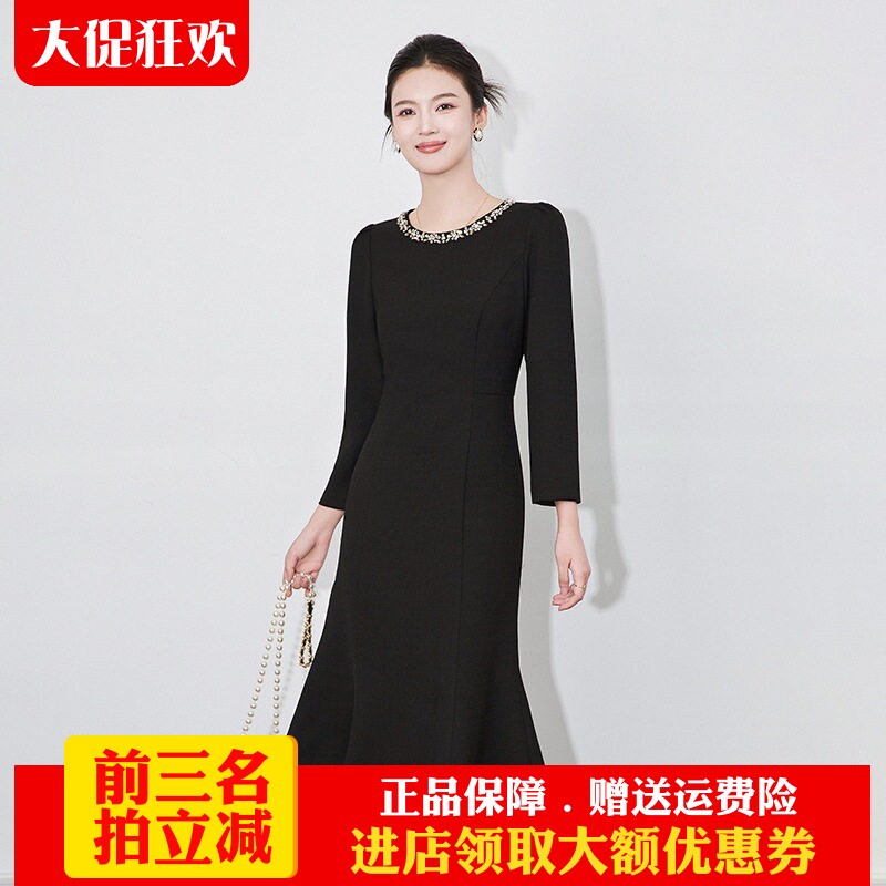 21988 欧洲站鱼尾礼服高端轻奢小众秋冬气质女人味修身V领连衣裙