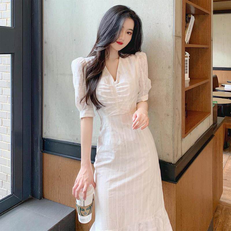 V领时尚气质优雅清冷感连衣裙女夏季新款百搭高级感显瘦鱼尾裙潮