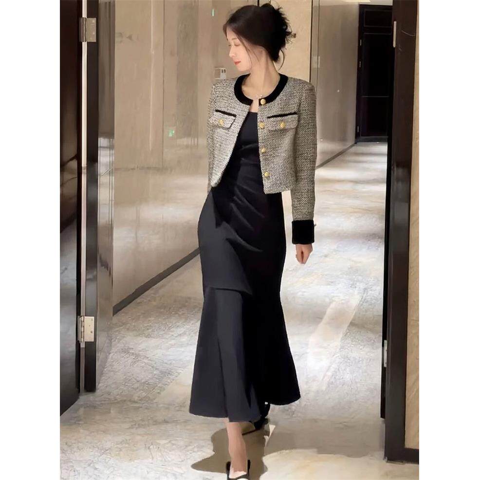 欧洲站秋装女2025新款法式气质修身显瘦黑色鱼尾连衣裙子两件套装