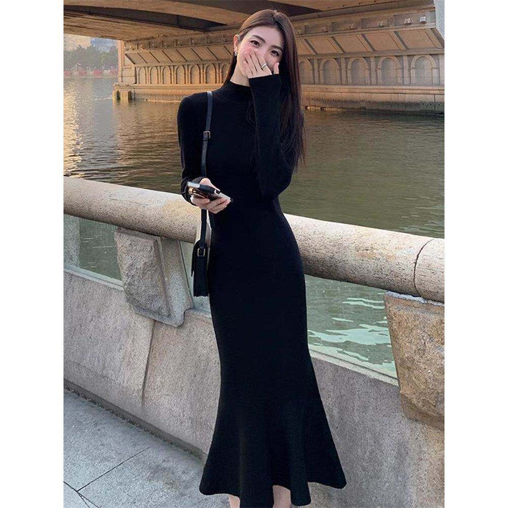 欧洲站赫本风黑色鱼尾裙长裙子修身显瘦针织内搭连衣裙女秋冬新款