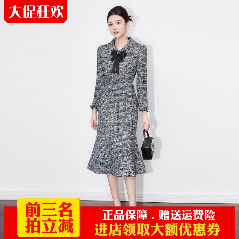 欧洲站2025秋季新款轻奢精致名媛小香风收腰气质粗花呢鱼尾连衣裙