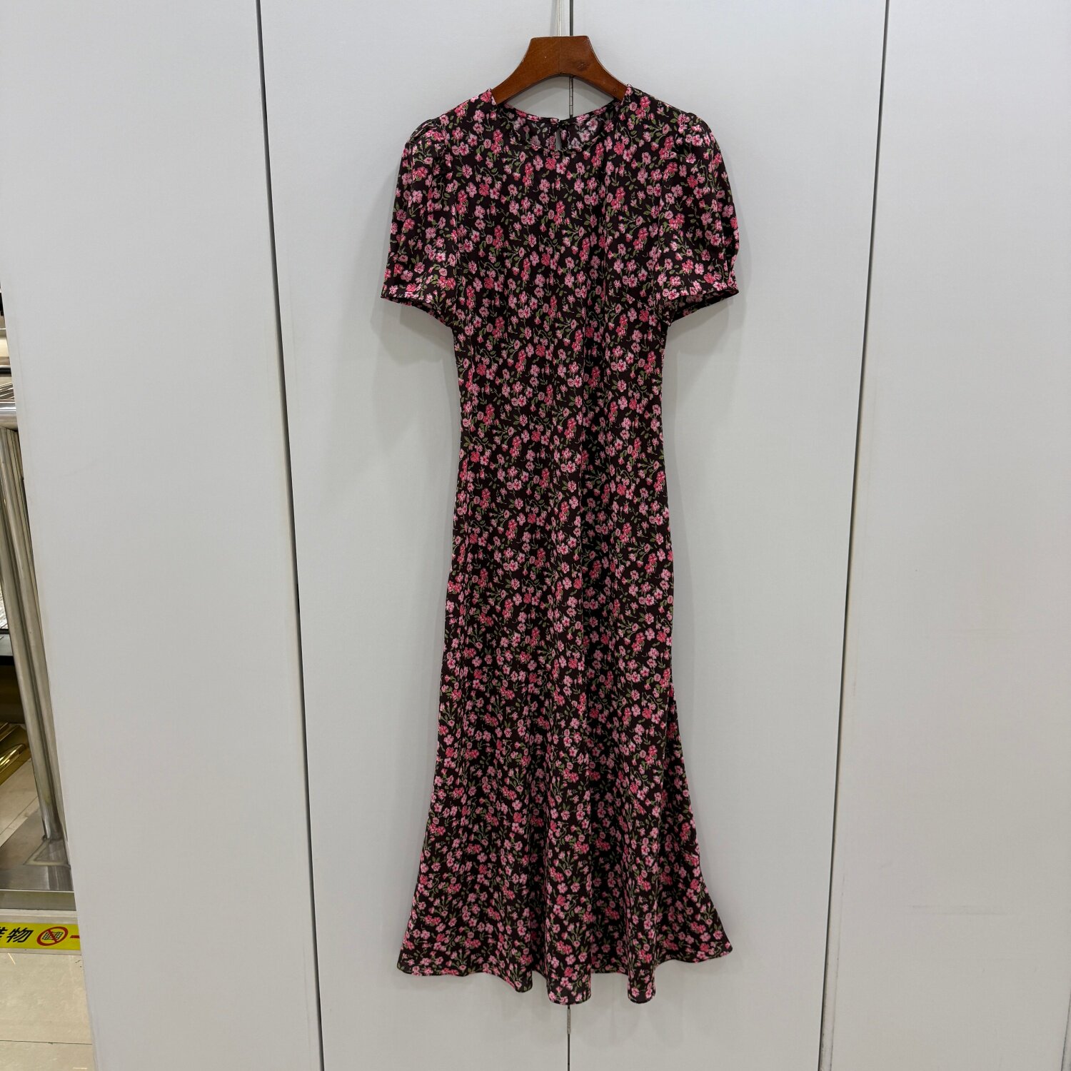 Q6361欧货26夏时尚圆领泡泡袖修身包臀小碎花长款真丝鱼尾连衣裙
