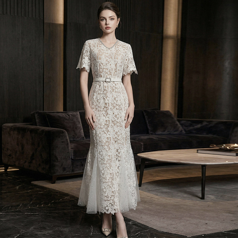 素木时尚蕾丝白色连衣裙女2025年夏季新款鱼尾裙欧货长裙大码女装