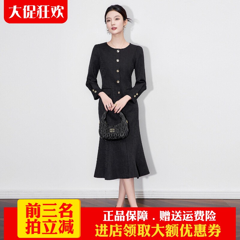欧洲站2025秋新款轻奢法式优雅名媛气质小香风收腰长袖鱼尾连衣裙