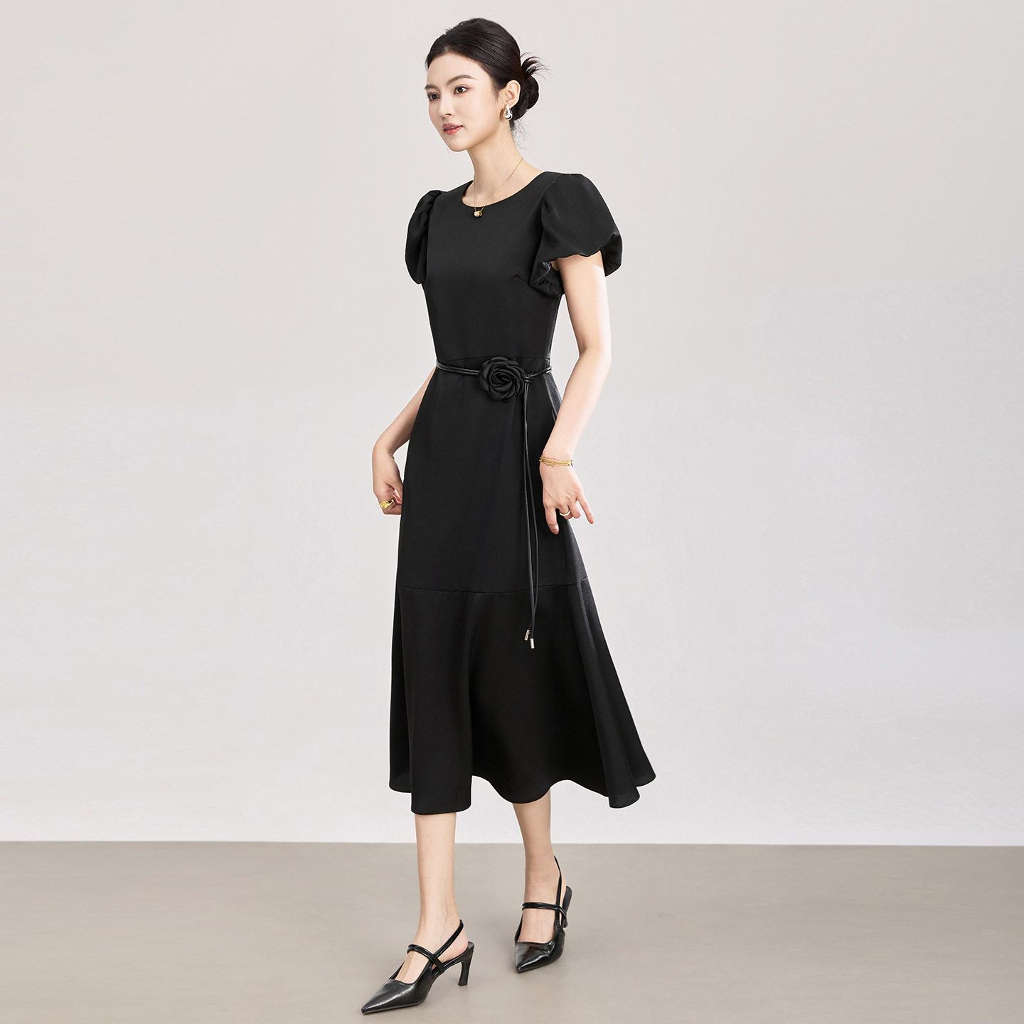 欧洲站2026夏季新款法式泡泡袖山茶花腰带气质修身鱼尾摆连衣裙女