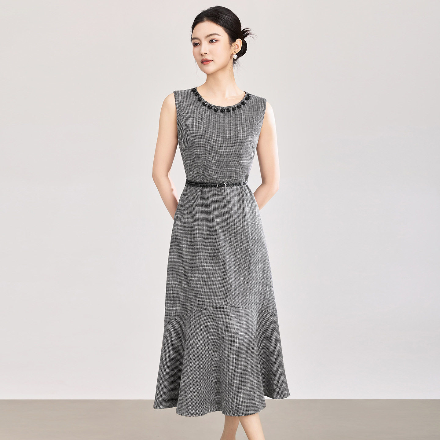 欧洲站2026夏季新款法式通勤典雅收腰钉珠鱼尾裙气质名媛风连衣裙