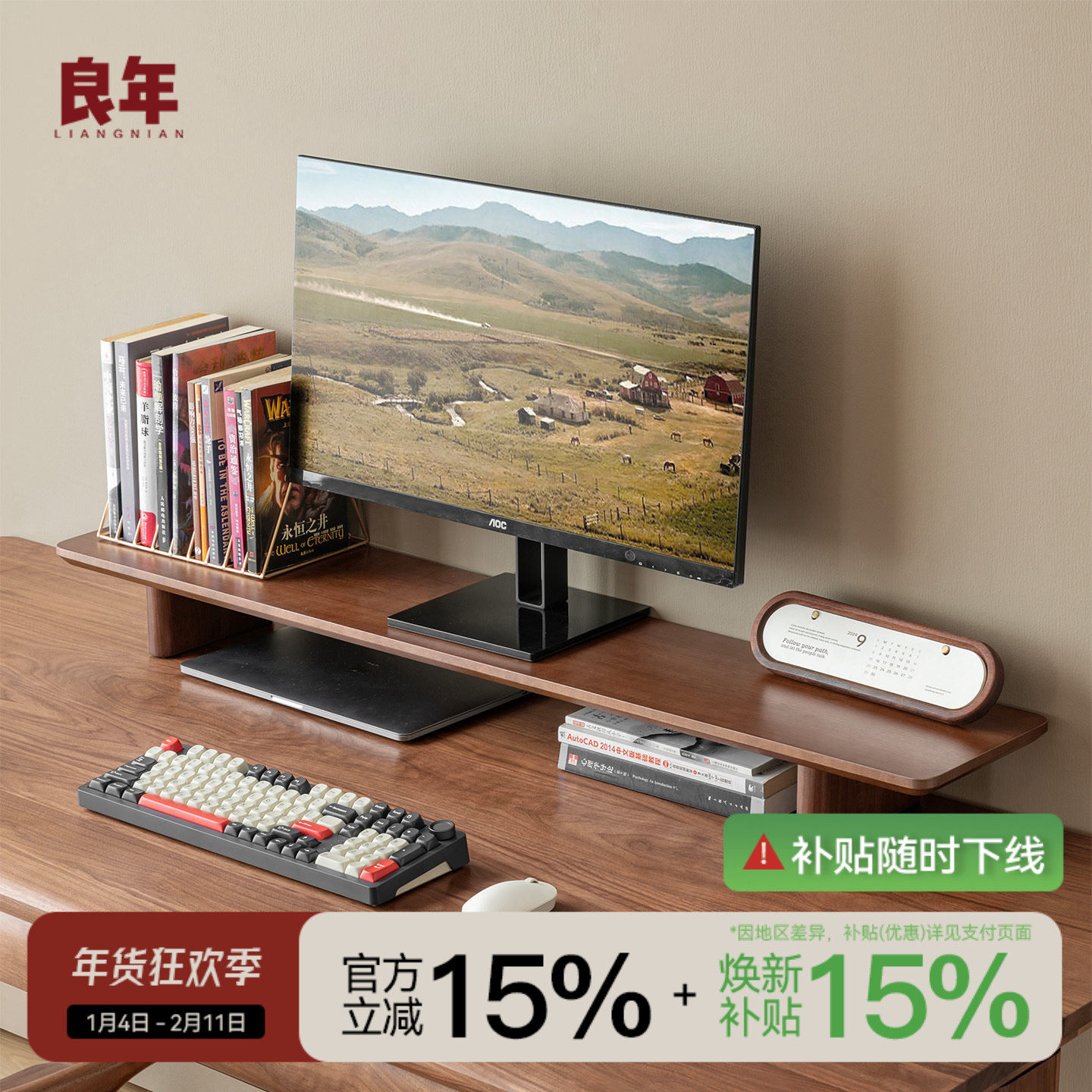 良年桌面显示器增高架黑胡桃木全实木书桌台式电脑置物架收纳ZJ01