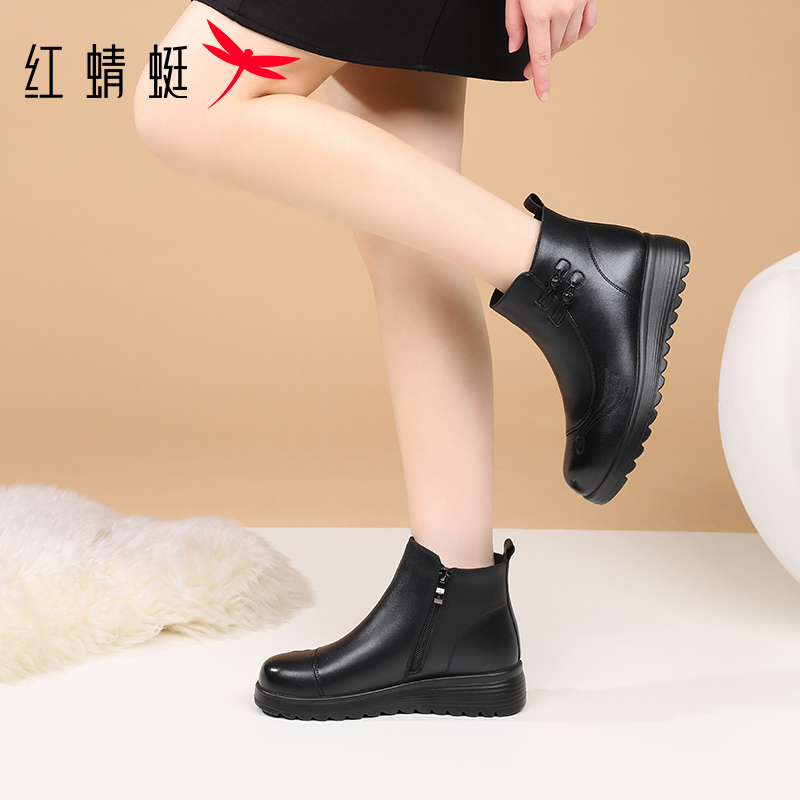 红蜻蜓女靴真皮妈妈短靴冬季新款薄绒粗跟厚底靴子加绒保暖棉靴女