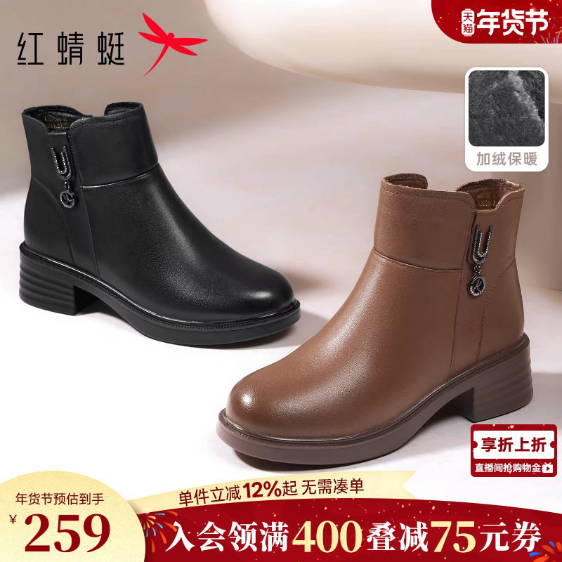 红蜻蜓妈妈靴子冬季新款女鞋靴粗跟羊皮短靴鞋子真皮加绒女士皮鞋