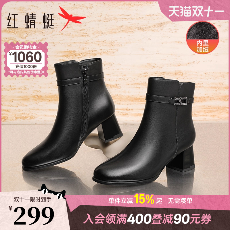 红蜻蜓妈妈靴子2025冬靴新款女鞋女士短靴高跟鞋子粗跟加绒皮鞋女
