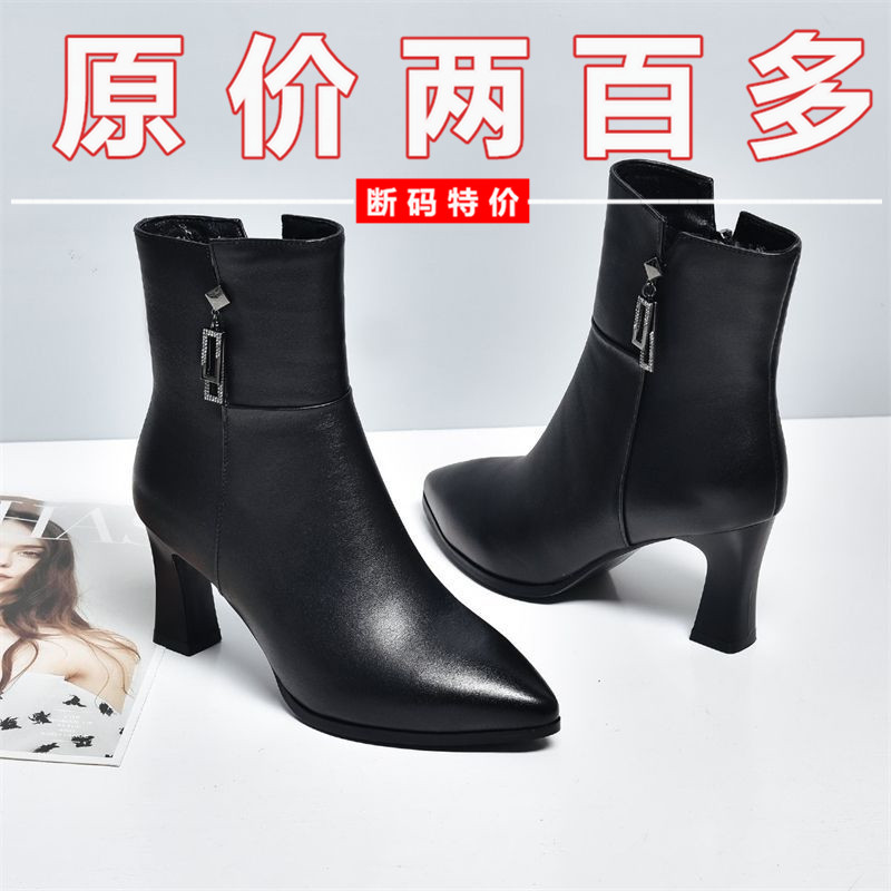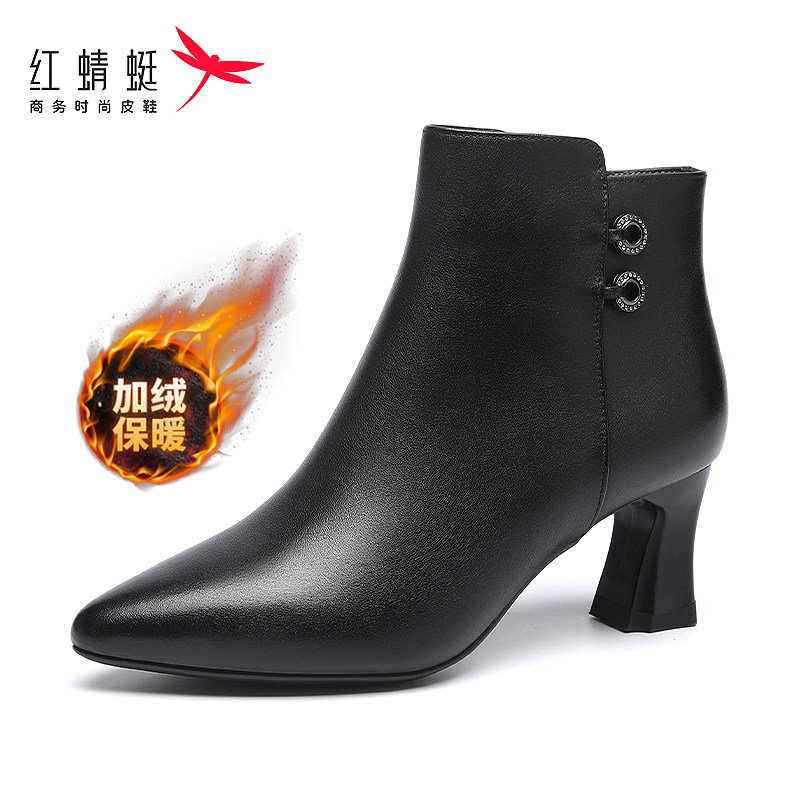 红蜻蜓高档妈妈短靴冬季加绒保暖高跟时装靴尖头粗跟真皮气质女靴
